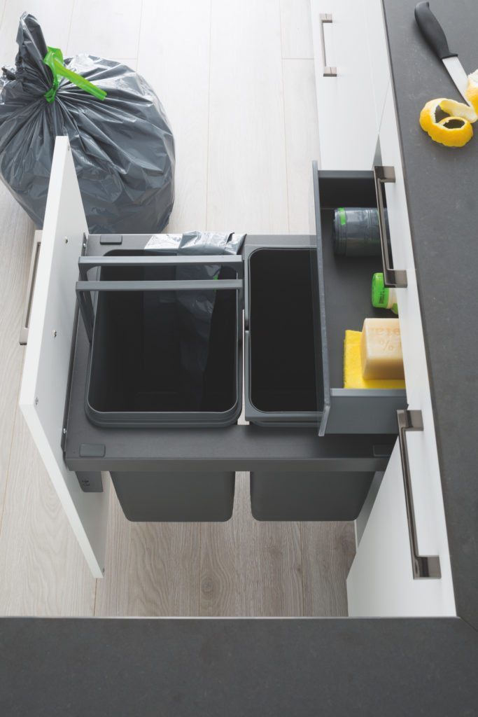 Most kitchen ranges come with the option to hide rubbish so that you don’t have to have a freestanding bin in the open. However, if you’re refreshing existing cabinets, storage mechanisms are sold separately by the likes of Häfele.